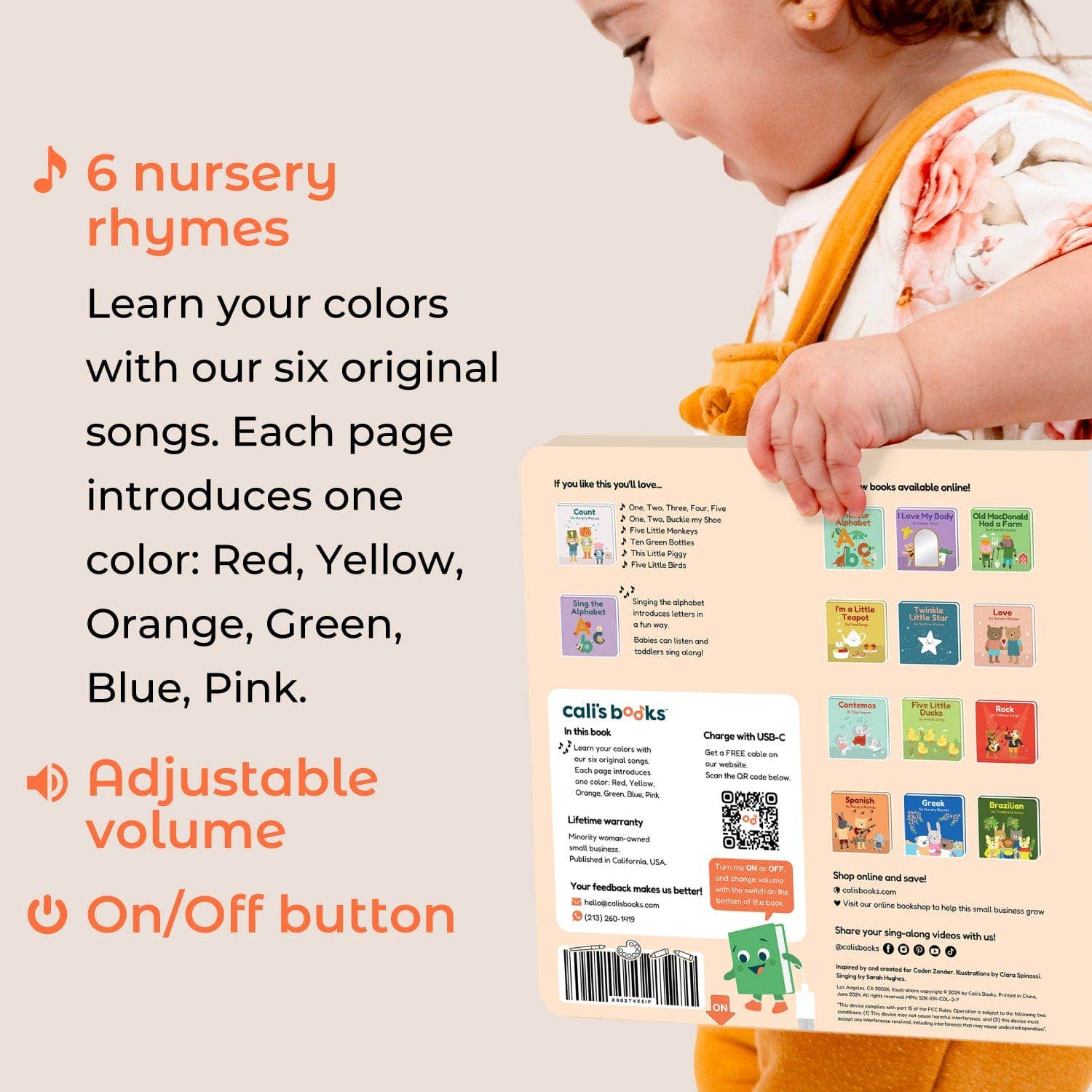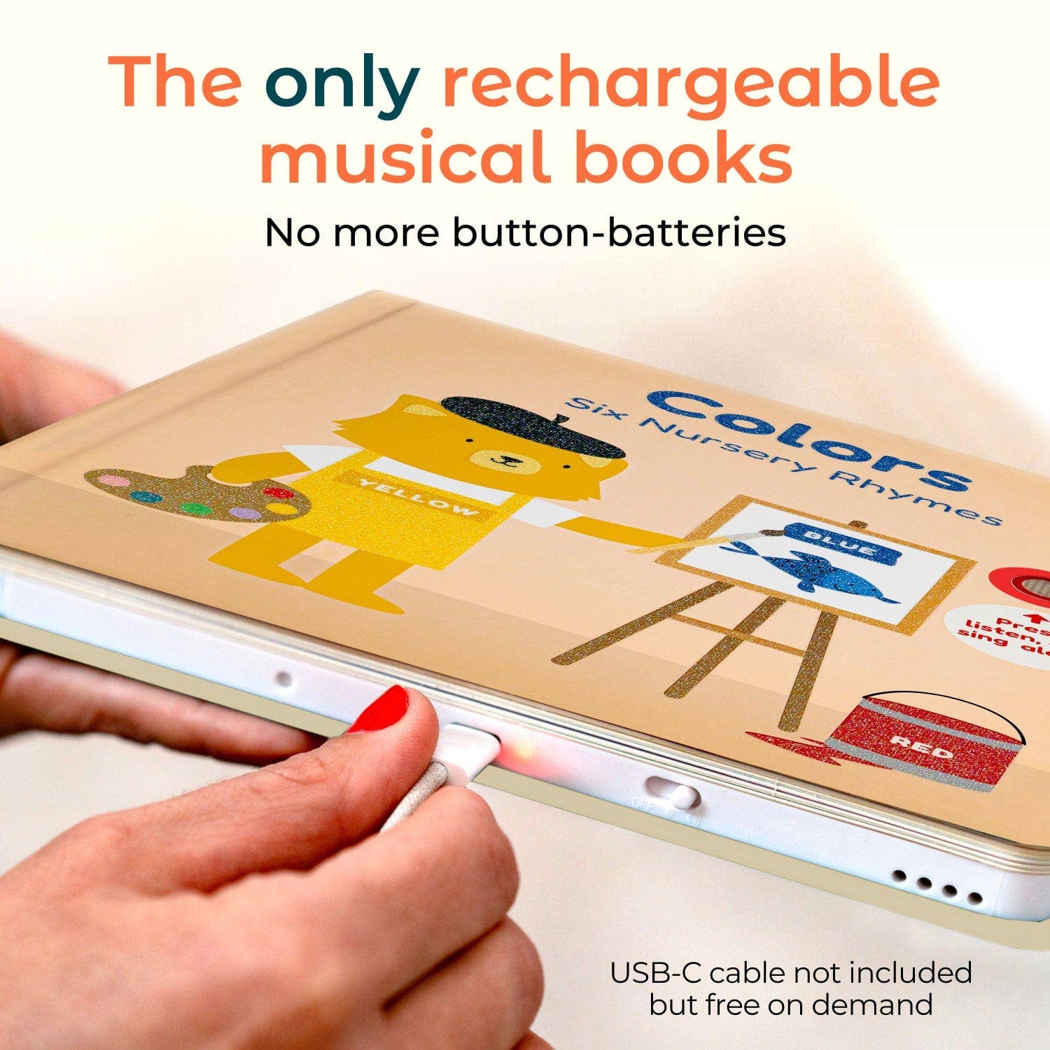 Songs include: Red, Yellow, Orange, Green, Blue, and Pink. Enhanced with a new volume control, improved speaker quality, and a fast, rechargeable battery for extended play. Please note: This book charges with a USB-C cable. Cable is not included with purchase.