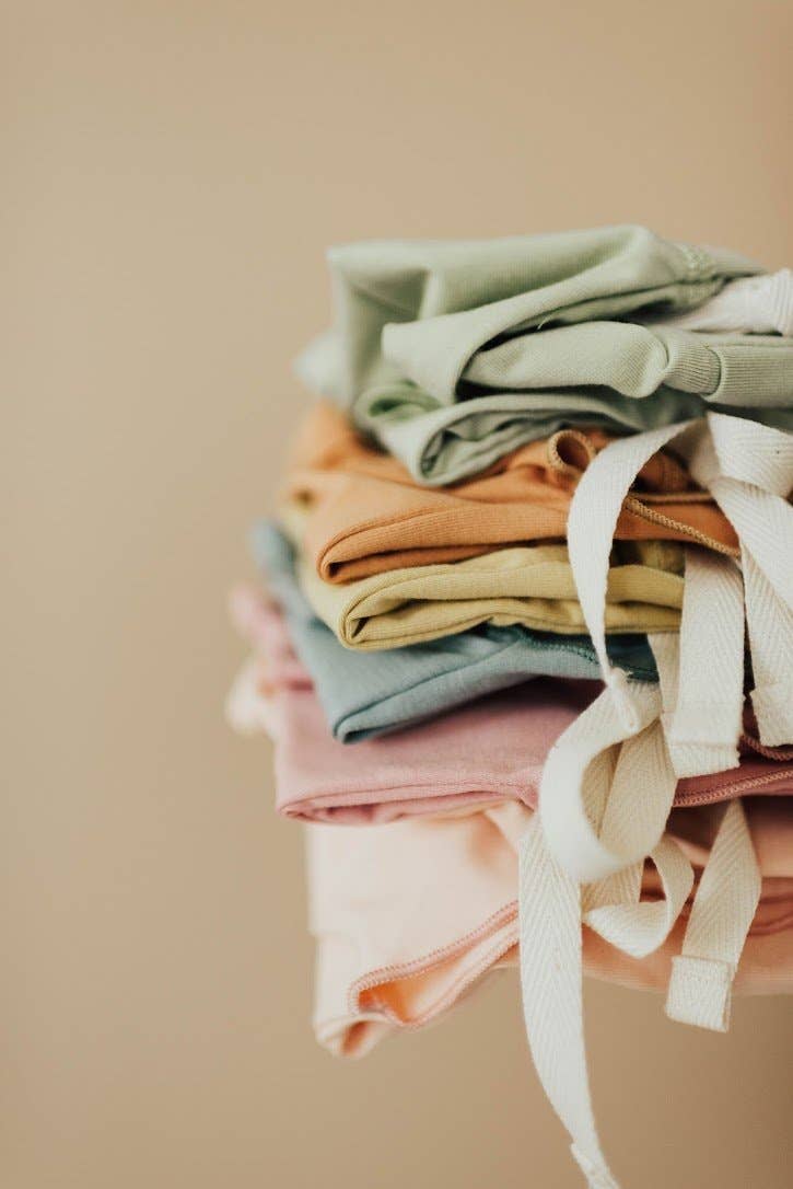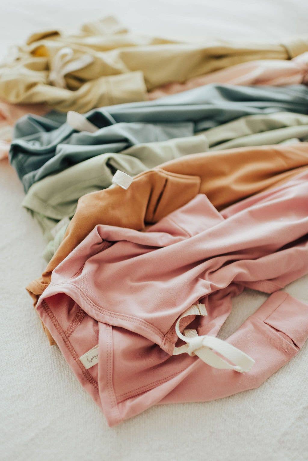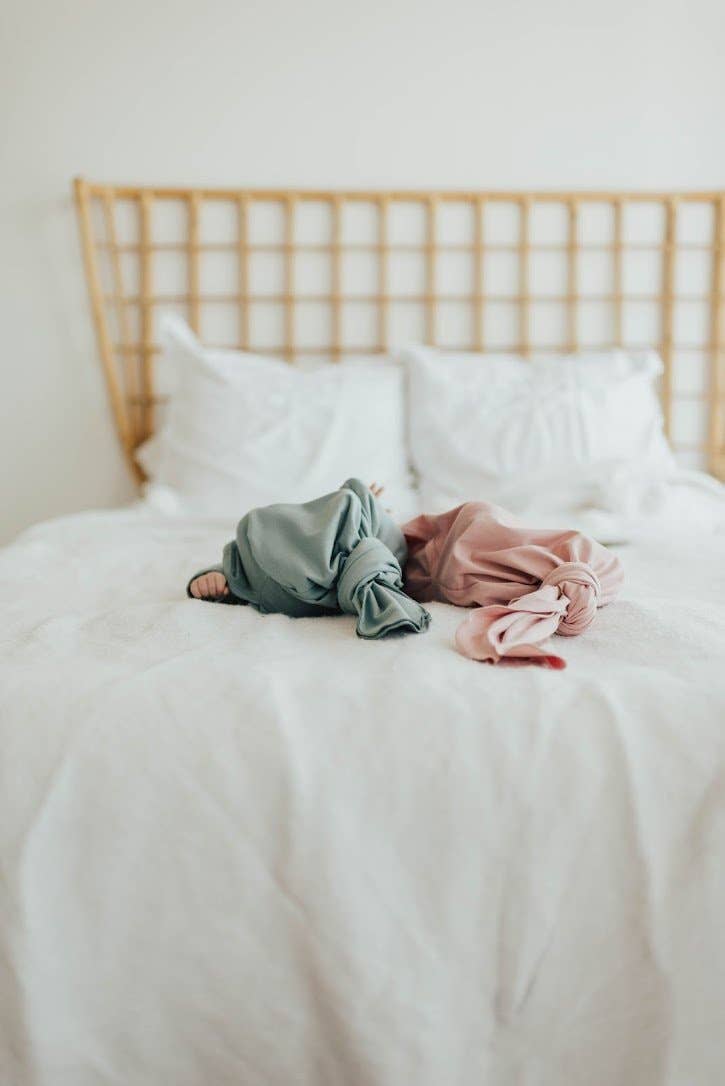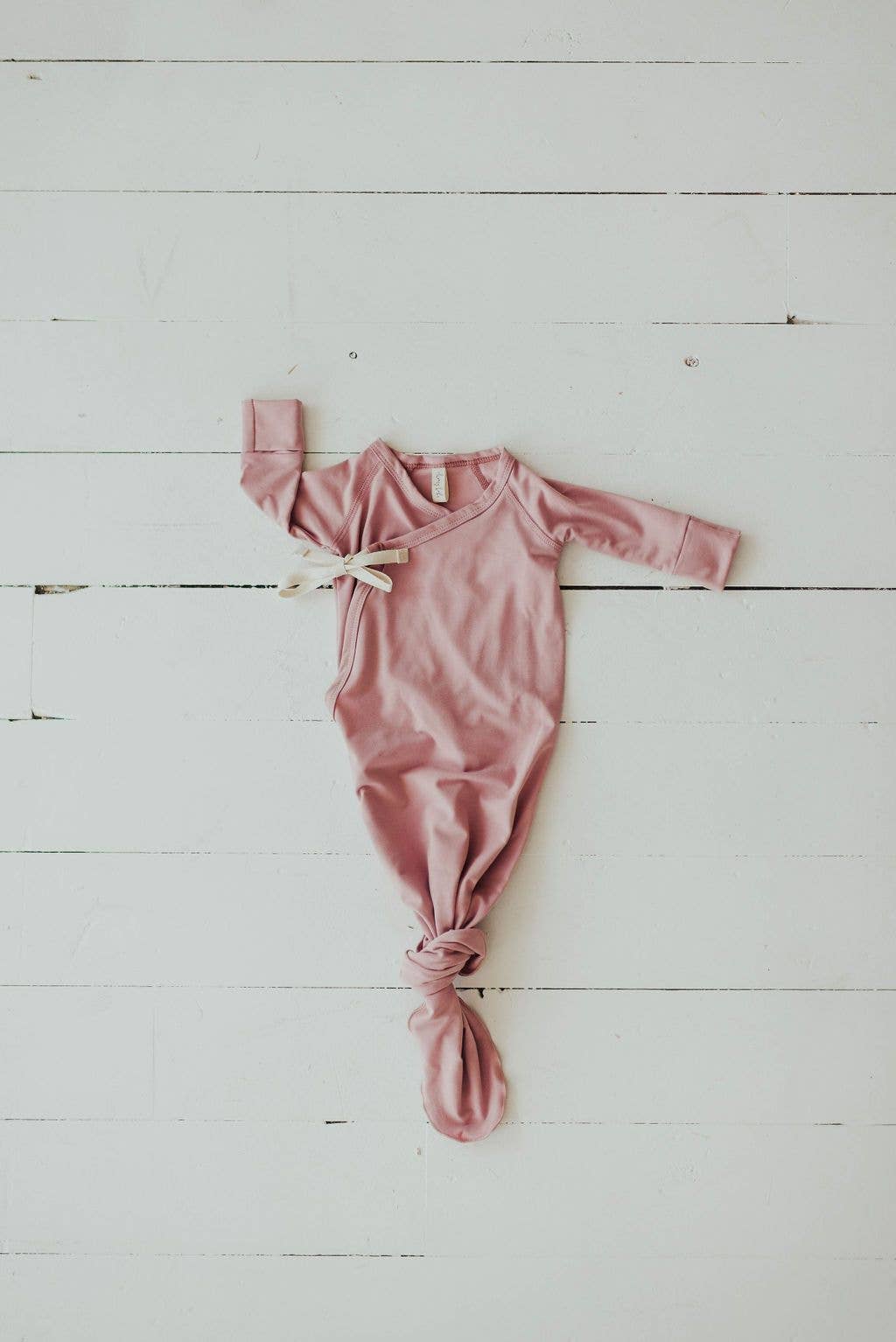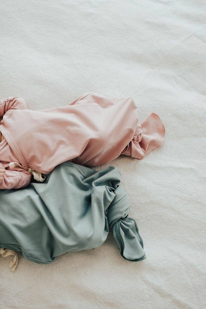 Double tie kimono for your ease in dressing your baby. A knotted bottom creates easy diaper changing, along with keeping your baby's feet warm.