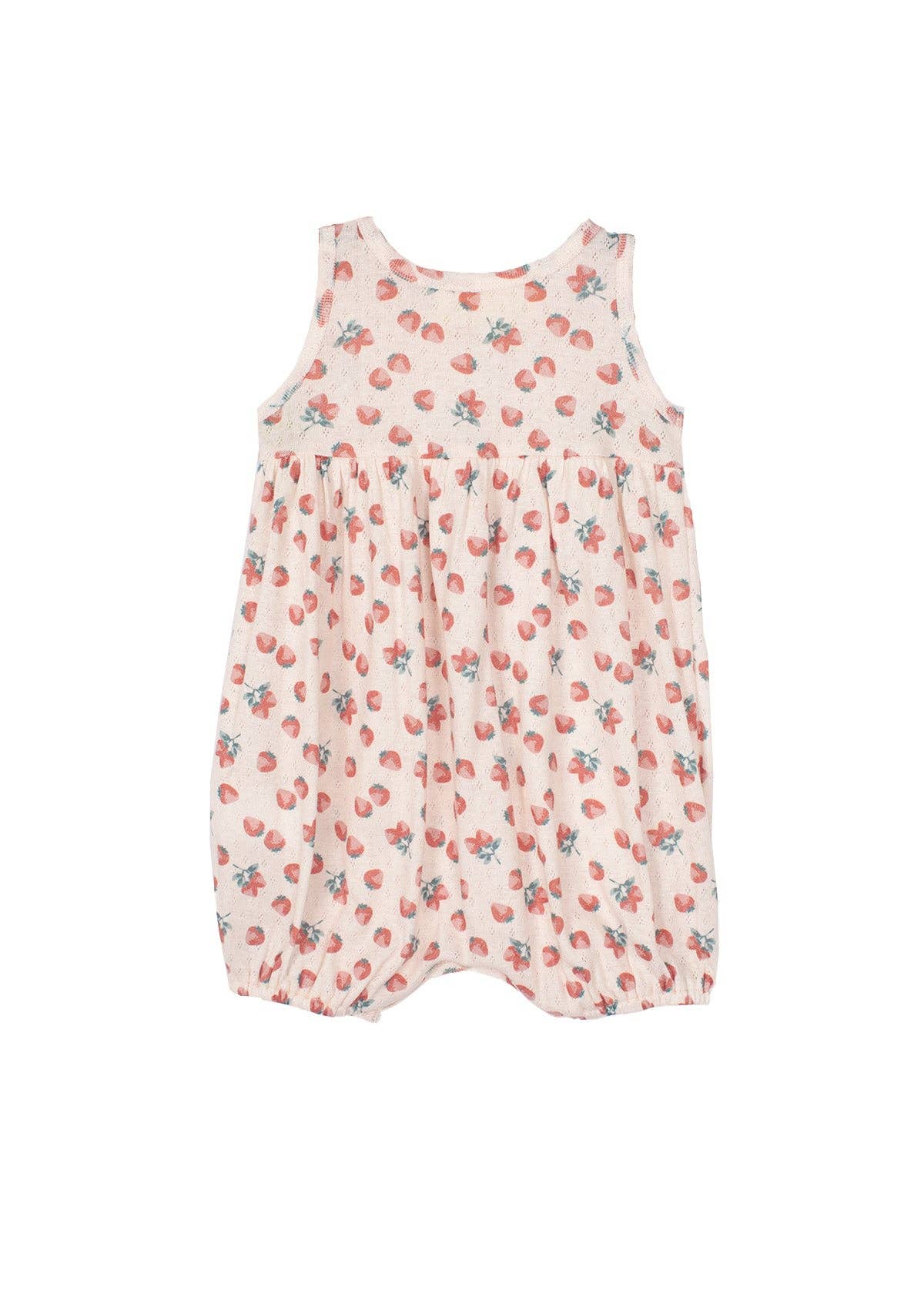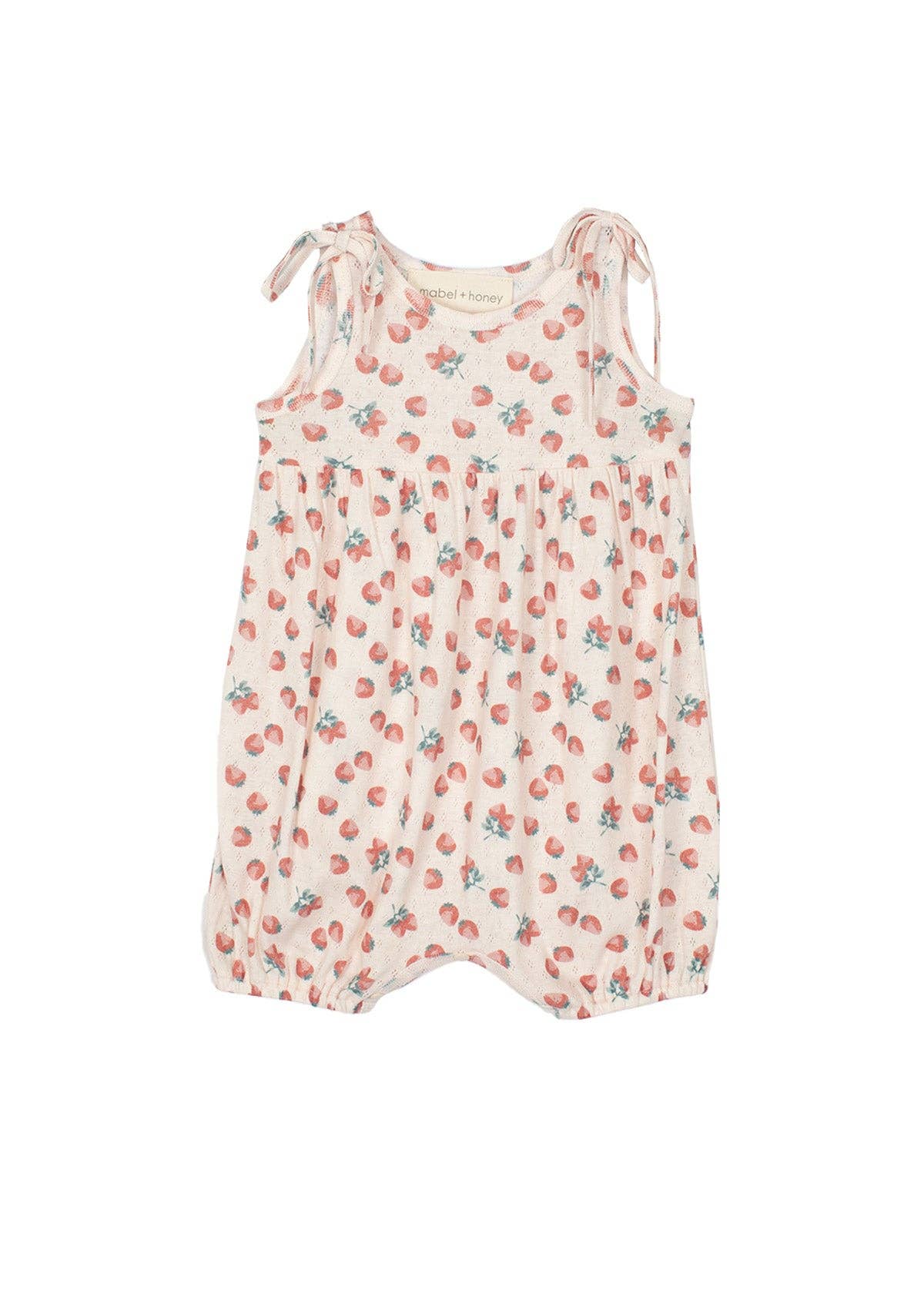 This adorable Strawberry Sweeheart baby girl's knit romper features a strawberry print with sweet bow details on the shoulder. Perfect for warm weather, combining style and comfort effortlessly.
