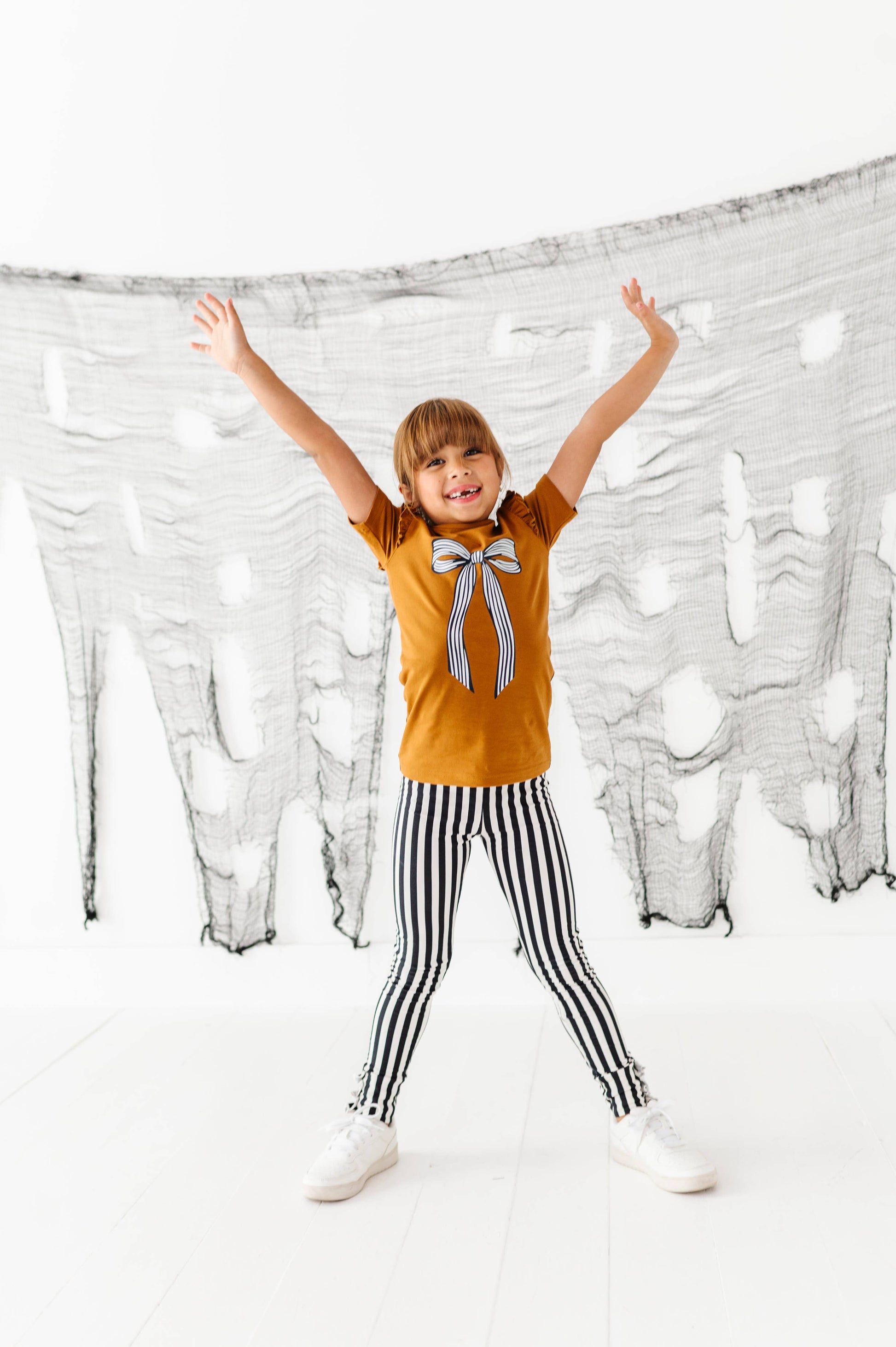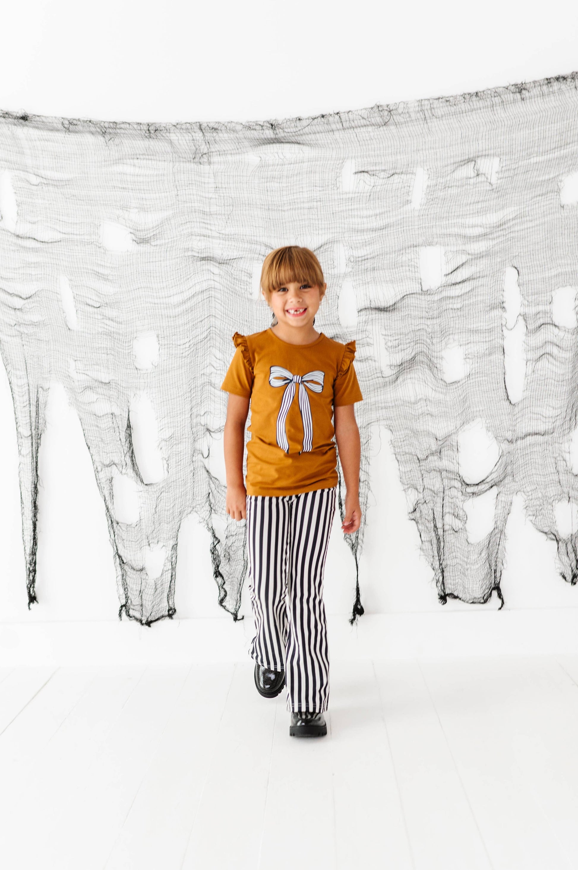 This playful striped bow top will be her go to for this autumn season. Pair it with the black& white bell bottom pants for the perfect outfit. The top color is Caramel.